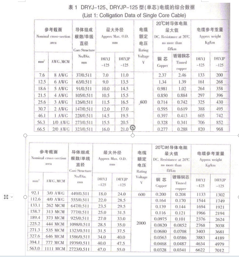 下面是石油平臺(tái)用電纜DRYJ-107MCM的詳細(xì)參數(shù):